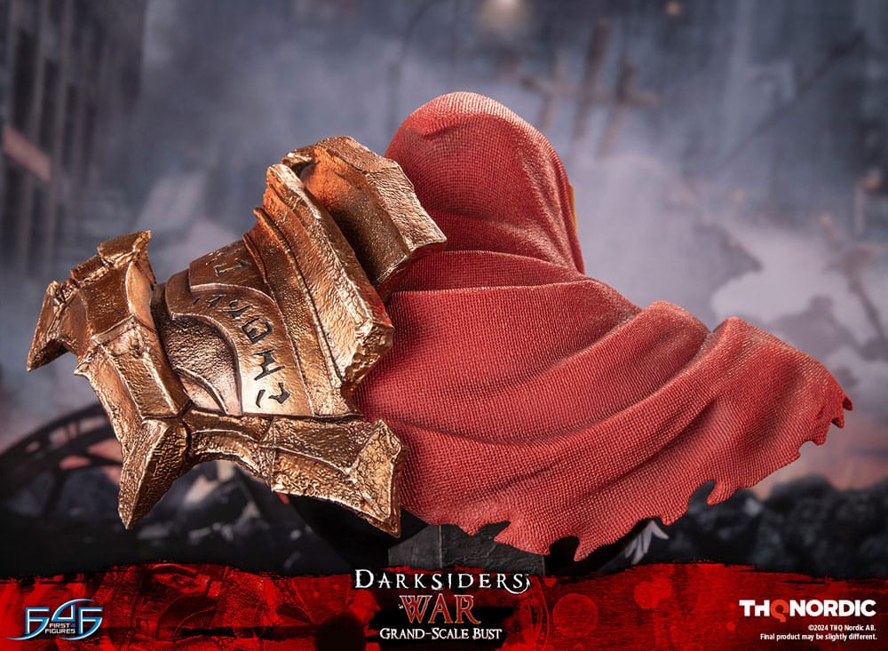 Darksiders - War Grand Scale Bust First 4 Figures proudly presents the Grand Scale Bust of War, one of the four Horsemen of the Apocalypse from the hit video game series, Darksiders. War is a formidable horseman embodying destruction, wielding the mighty Chaoseater to bring balance to the tumultuous realms. His stoic demeanor and relentless pursuit of justice make him a force to be reckoned with. In this Grand Scale Bust, War's head and upper torso are recreated in exquisite detail. The bust is made to be appreciated at any distance. When viewed from afar, War's silhouette, with his long, flowing hair and menacing suit of armor, is as imposing as he appears in the game. Up close, the incredible sculpting and painting bring War to life with realistic details. The War Grand Scale Bust looks amazing from any angle, and the manually rotating base allows collectors to show off War however they choose. The base also includes runic inscriptions from the mysterious Void Between Worlds, a location featured throughout the Darksiders series. Darksiders - War Grand Scale Bust includes: - Lifelike Bust of Fury - Ultra-Realistic Upper Torso and Head - Manually Rotating Base with Runic Inscriptions - Limited edition numbering & Authentication Card Product Size: 36,5 x 30 x 37 cm product on pre-order with a fixed date (August 2025)