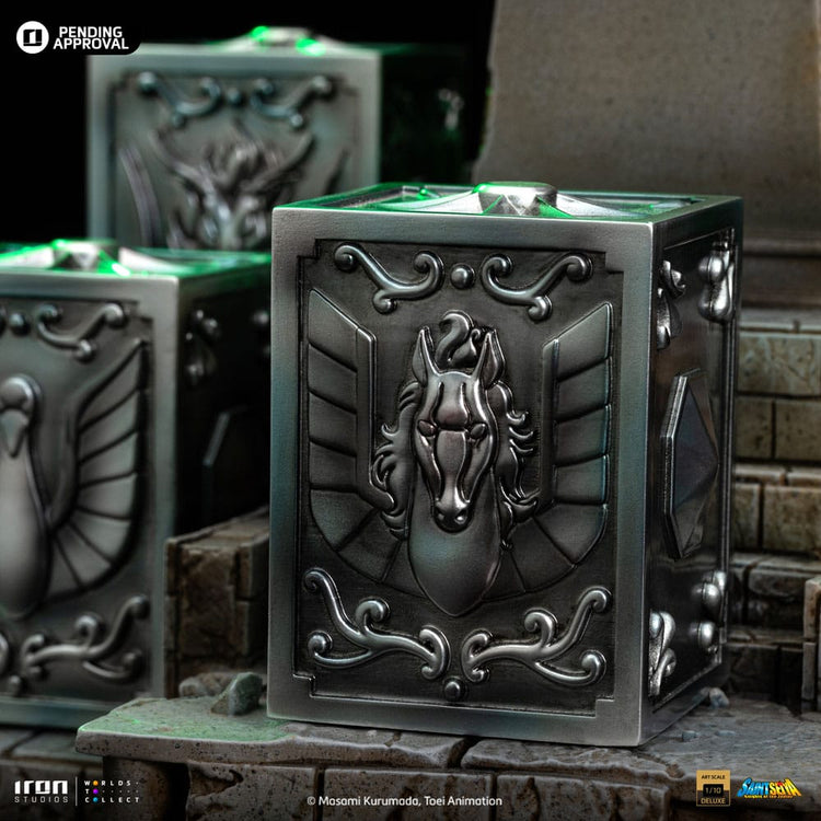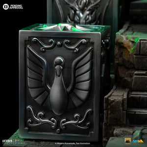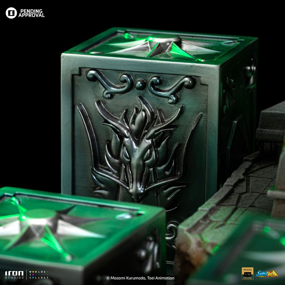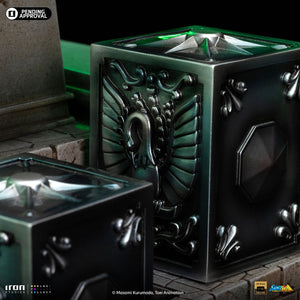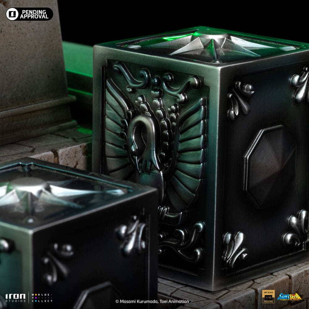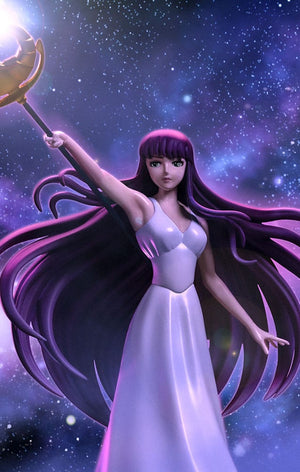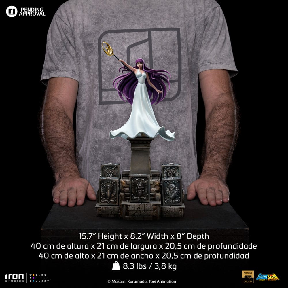 La reincarnazione della Dea Atena di Saint Seiya in una nuova statua realizzata da Iron Studios! Dall'alto di un altare di cemento, una bellissima giovane donna dal corpo magro e sinuoso, dal viso delicato e dalle labbra rosa, con indosso un lungo abito bianco, solleva il suo bastone sacro sopra i suoi lunghi capelli viola, puntandolo verso l'alto, con un volto pacifico e tranquillo. Sotto i suoi piedi, sopra i gradini millenari del suo santuario, riposano cinque Scatole di Pandora dei santi di bronzo Pegasus, Cygnus, Dragon, Andromeda e Phoenix, contenenti i rispettivi potenti drappi, per i cinque eroi difensori della dea Atena rinati per proteggere il mondo nel XX secolo. Iron Studios è orgogliosa di presentare l'esclusiva statua "Saori Kiddo Deluxe - Saint Seiya - Art Scale 1/10", la reincarnazione di Atena, la dea della saggezza, della guerra, della strategia, della giustizia e della speranza. Notata e lodata per la sua bellezza, Saori è Atena rinata, simbolo di giustizia per tutti i Saints, è la dea che ha ereditato da Zeus, suo vero padre, il controllo sulla Terra. Reincarnandosi una volta ogni 200 anni per impedire al male di dominare il mondo, è cresciuta come nipote adottiva di Mitsumasa Kiddo, un uomo d'affari giapponese che ha visitato le rovine della città. Un uomo d'affari giapponese che visitò le rovine del tempio di Atena in Grecia. Mentre esplorava le rovine, trovò il Sagittario Aiolos ferito a morte con in braccio un bambino. Consegnò la bambina a Kiddo, che la adottò e la portò in Giappone dove ricevette il nome di Saori Kiddo e fu dichiarata nipote di Mitsumasa. All'inizio all'inizio non andava d'accordo con i bambini che sarebbero poi diventati i suoi protettori. Il suo cosmo è in grado di curare i Santi in punto di morte e il suo sangue può rivelare il potere nascosto delle Stoffe. Sorvegliata dai 12 Santi d'Oro e dai 5 Santi di Bronzo, ha un potente Cosmo di Luce, capace di grandi imprese, come fermare lo scivolamento dei ghiacciai dell'Argard e impedire a Poseidone di inondare il mondo, oltre a stordire i nemici. È innamorata di Seiya, ma entrambi sanno che non possono stare insieme. Originariamente creato nel manga da Masami Kurumada nel 1986 e adattato ad anime dalla Toei Animation tra il 1986 e il 1989, la serie Saint Seiya racconta la storia di cinque mistici Bronze Saints che combattono per proteggere la reincarnazione umana della dea Atena, indossando abiti sacri basati su diverse costellazioni. Presentate all'Inside Iron Studios Day di marzo, già disponibili per il pre-ordine, le altre statue della collezione Saint Seiya di Iron Studios, con le future uscite già rivelate The Master of Sanctuary, Pegasus Seiya Deluxe, Cygnus Hyoga Deluxe, Dragon Shiryu Deluxe e Andromeda Shun Deluxe, con i Bronze Saints disponibili anche in versione normale. La statua in scala 1/10 è alta circa 51 cm e viene fornita con una base coordinata.