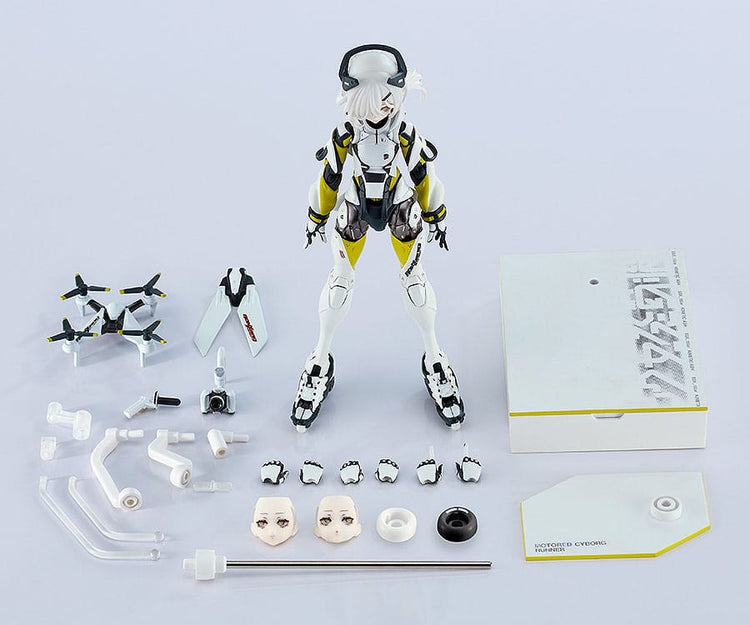 Vi presentiamo la prossima serie di action figure "SHOJO-HATSUDOKI MOTORED CYBORG RUNNER" di AF_KURO, Max Factory e Sentinel! Dalla serie di illustrazioni SHOJO-HATSUDOKI dell'illustratore AF_KURO, che presenta cyborg da corsa dotati di motori a combustione interna, arriva KINETIC ASH, il corpo motore allestito per fotografare i corridori che corrono per le strade di Tokyo. Al modello sono state aggiunte delle alette articolate per migliorare la velocità e la stabilità in curva ed è dotato di una fotocamera stabilizzatrice, di un microfono a pistola e di un drone fotografico ausiliario. I suoi capelli fluenti sono stati accuratamente scolpiti per creare una silhouette naturale. La combinazione di colori chiari e l'aspetto svolazzante da cenere bianca contribuiscono a creare l'atmosfera del servizio fotografico. Questo modello presenta anche parti in pressofusione in alcune aree, come le gambe. Le figure meccaniche ma articolate possono essere facilmente visualizzate in pose d'azione per le situazioni di gara.