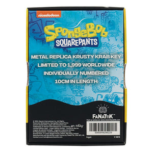 This special replica key as seen in 'Patty Hype' is made from 24k gold plated metal and shaped into two K's, the Krusty Krabs initials. To commemorate SpongeBob's first TV debut year, this key has been limited to 1999 worldwide with each being individually numbered.